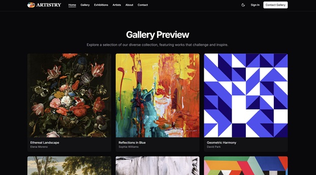A landing page for an art gallery